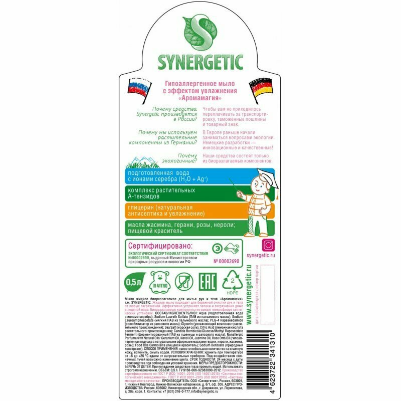 | Отзыв: | SYNERGETIC Растительные компоненты из Германии. БИОРАЗЛОГАЕМОЕ МЫЛО АРОМА МАГИЯ. Отличное мыло жидкое, структурированная вода с иконами серебра, гипоаллергенное мыло с эффектом увлажнения АРОМА МАГИЯ. Состав :вода с иконами серебра, комплекс растительных тензидов, глицерин (натуральная антисептика и увелажнение), масла жасмина, герани, розы, нероли, пищевой краситель. Отлично устраняет загрязнение даже в холодной воде. Шикарное жидкое мыло для рук ?. |