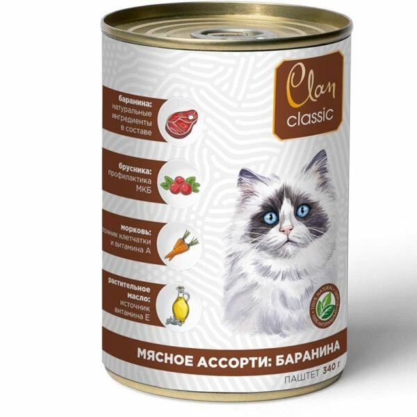 Консервы для котят Clan Classic, мясное ассорти с бараниной, брусникой и рыбьем жиром 340 г