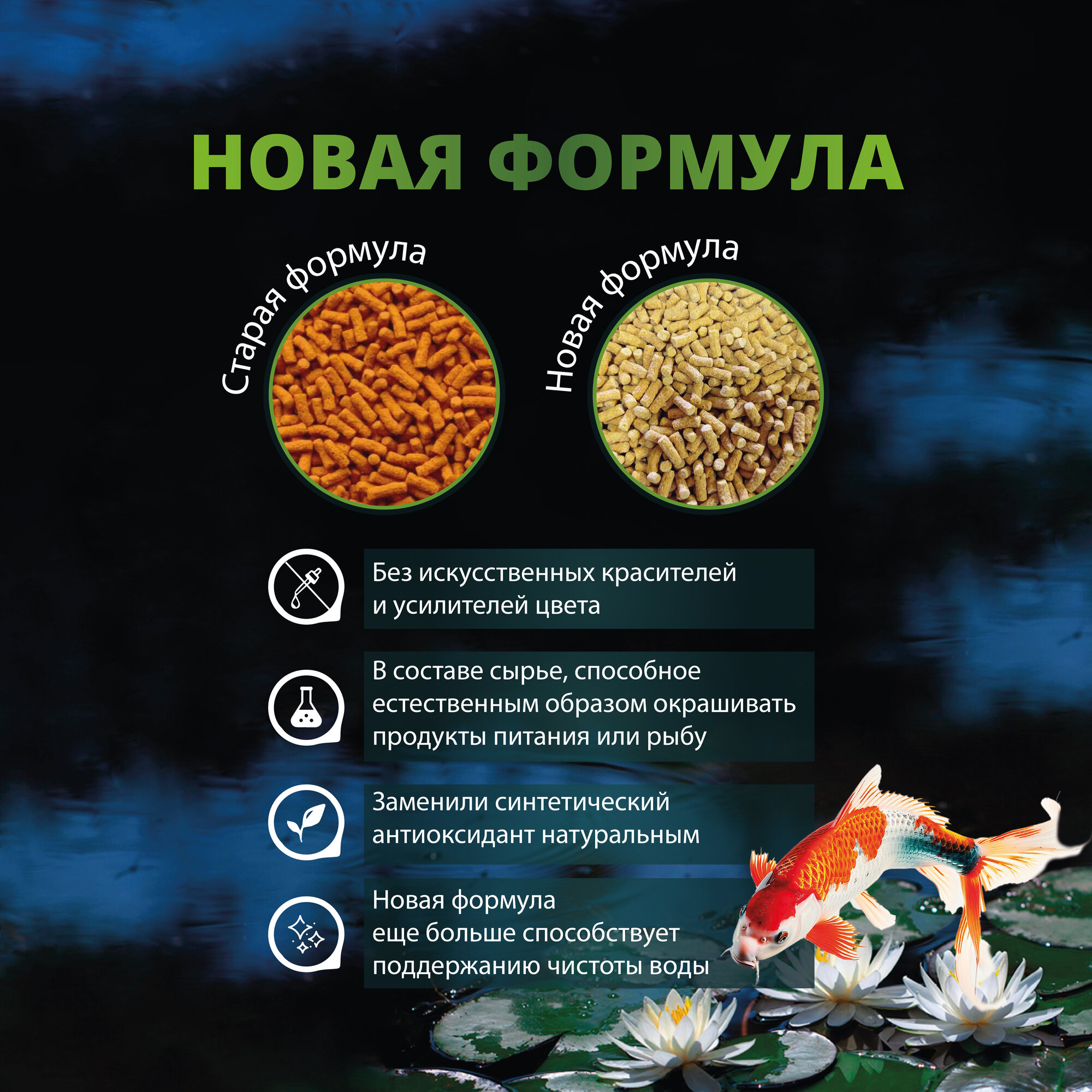 | Плюсы: | Один из лучших для прудовых рыб. Подходит в тех случаях, когда в пруду есть рыбы разных размеров - и крупные и мелкие. Усиливает интенсивность окраски кои и комет |