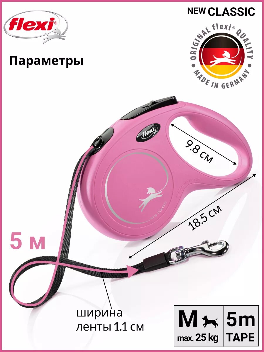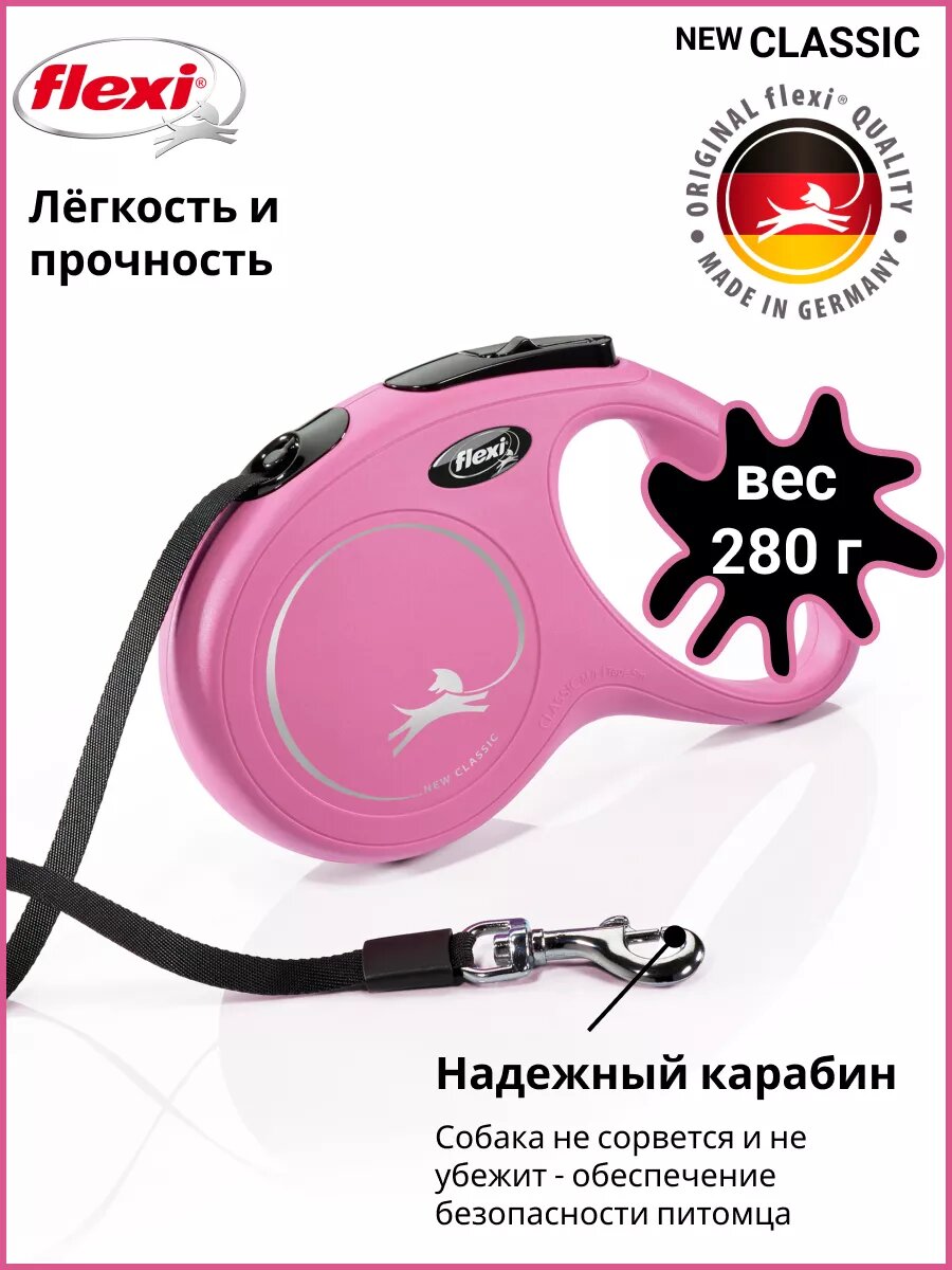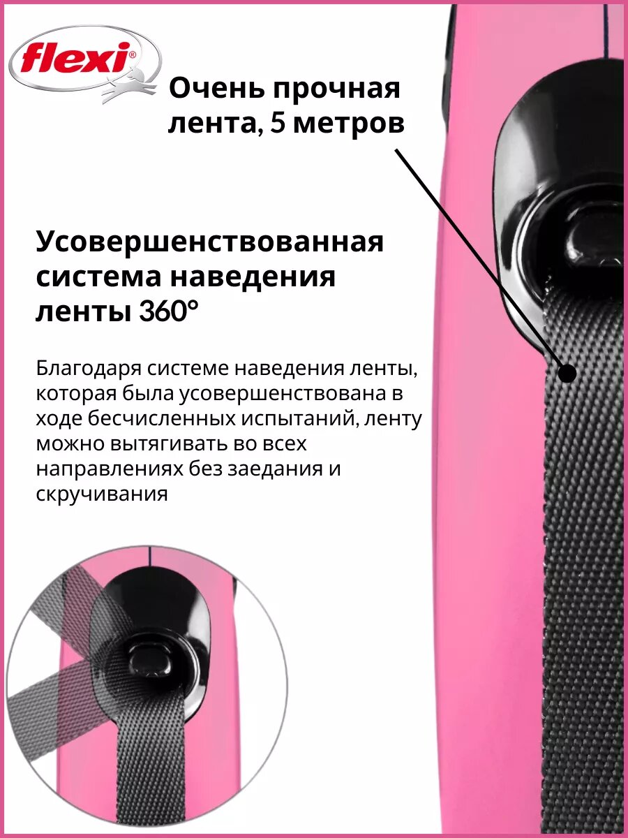 Рулетка FLEXI NEW CLASSIC M ремень 5 м 25 кг; розовый