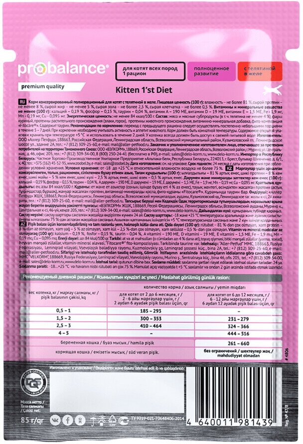 ProBalance 85гр 1st Diet корм для котят с телятиной в желе пауч
