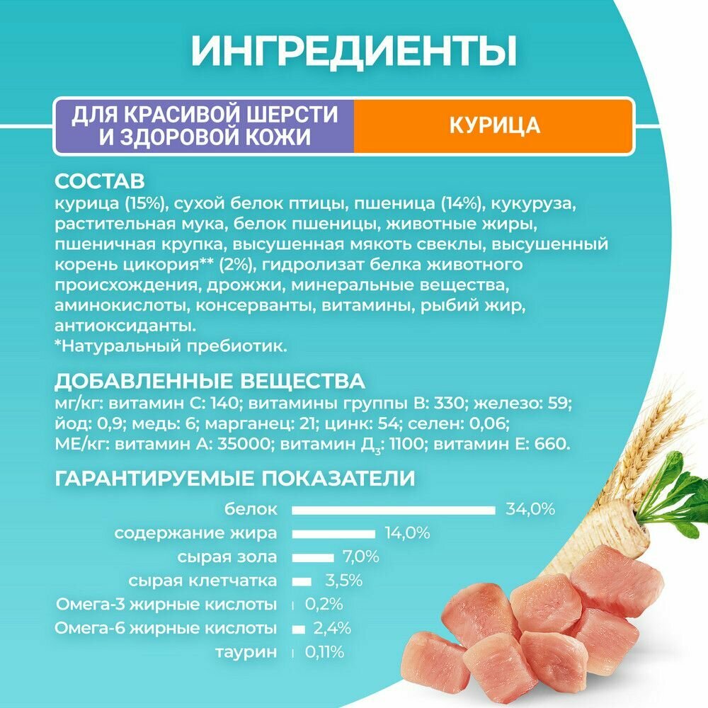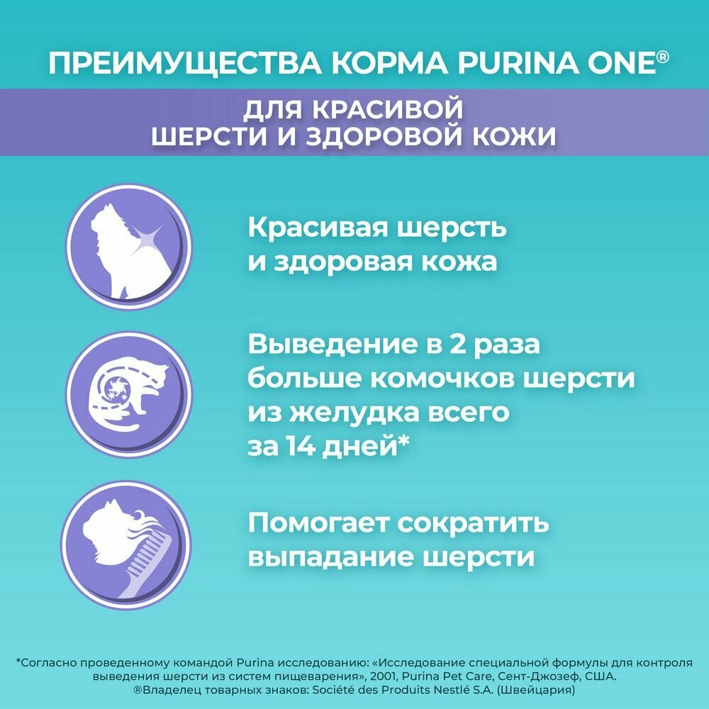 Сухой корм Purina ONE для кошек для красивой шерсти и контроля образования волосяных комков с курицей и цельными злаками, Пакет, 750 г,Для взрослых кошек