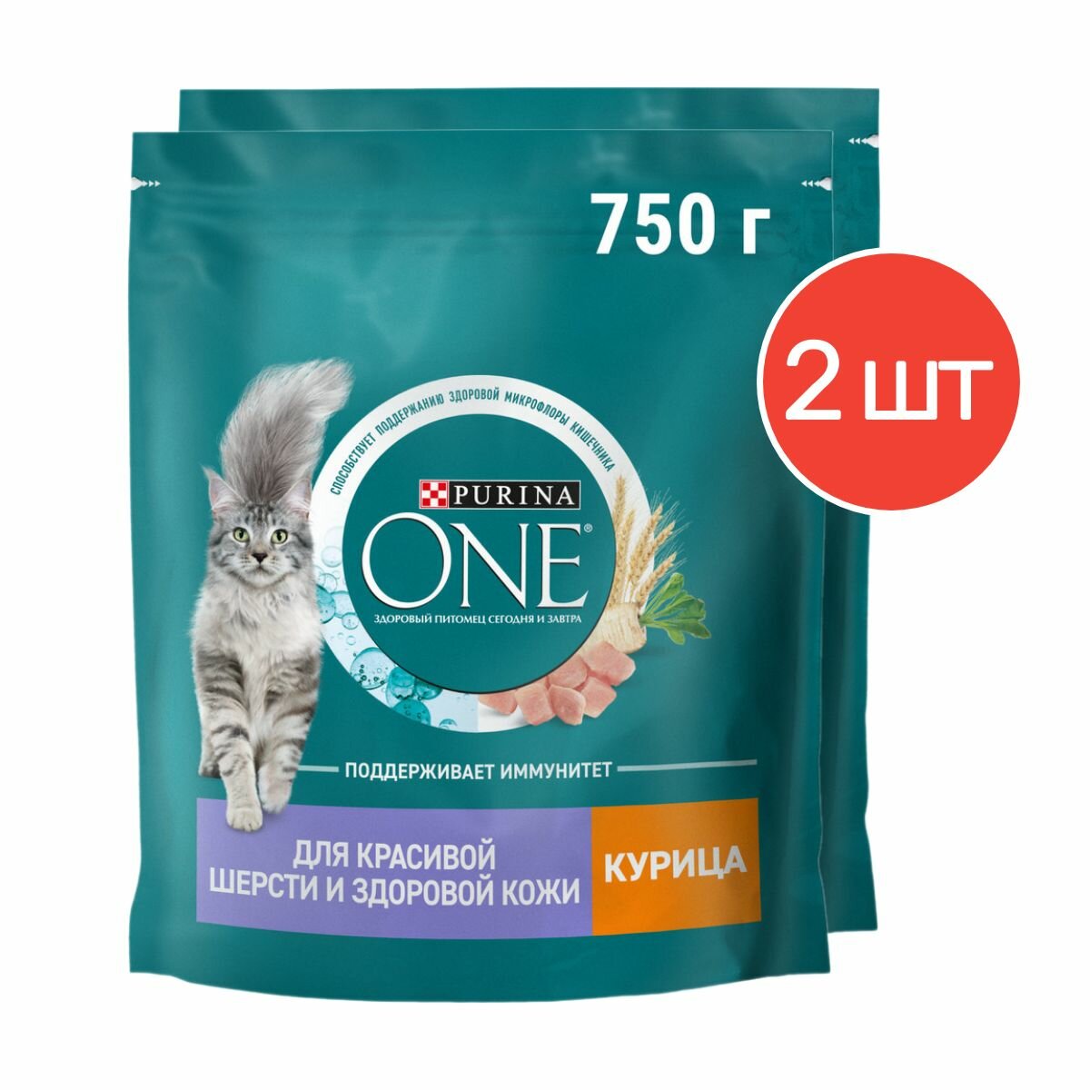 Сухой корм Purina ONE для взрослых кошек для красивой шерсти, здоровой кожи и контроля образования волосяных комков, с высоким содержанием курицы и цельными злаками 750 г х 2шт