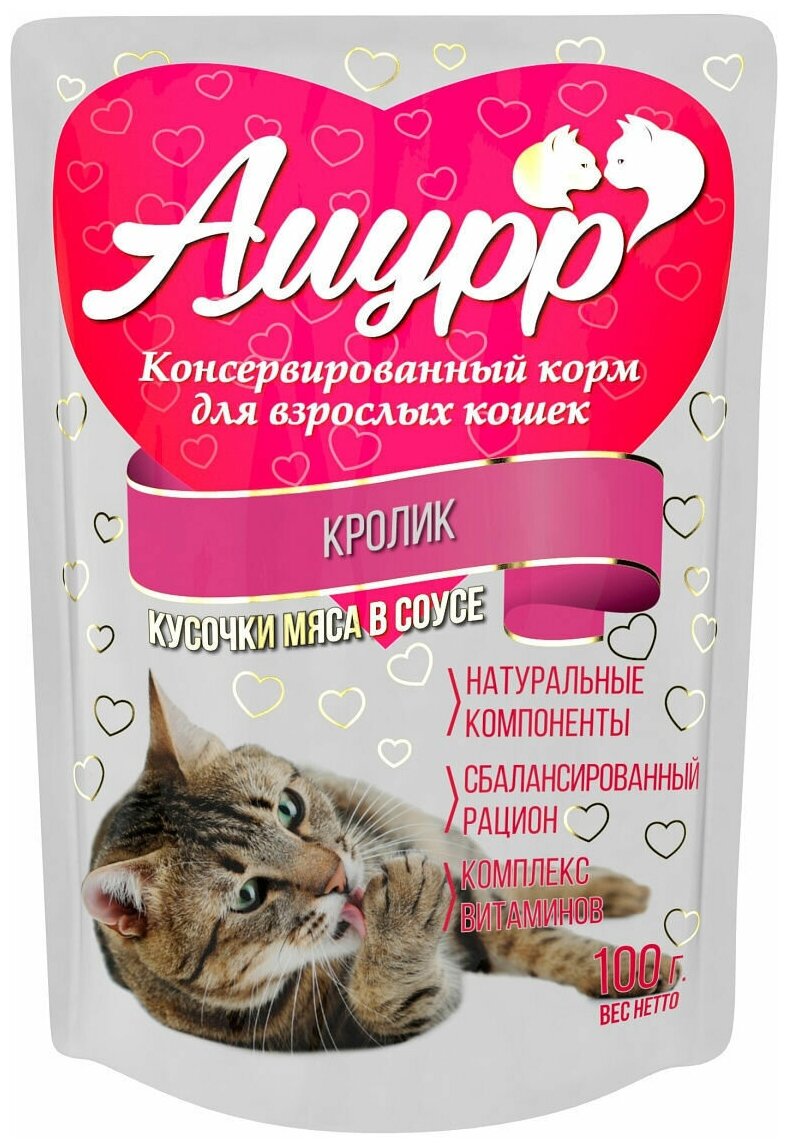 Амурр 100г Консервы для кошек кусочки мяса в соусе кролик пауч 24х100г