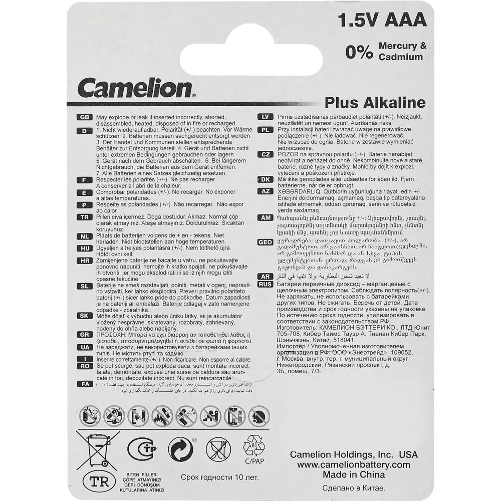Батарейки щелочные Camelion - тип AAA, 1.5В, 10 шт. в упаковке