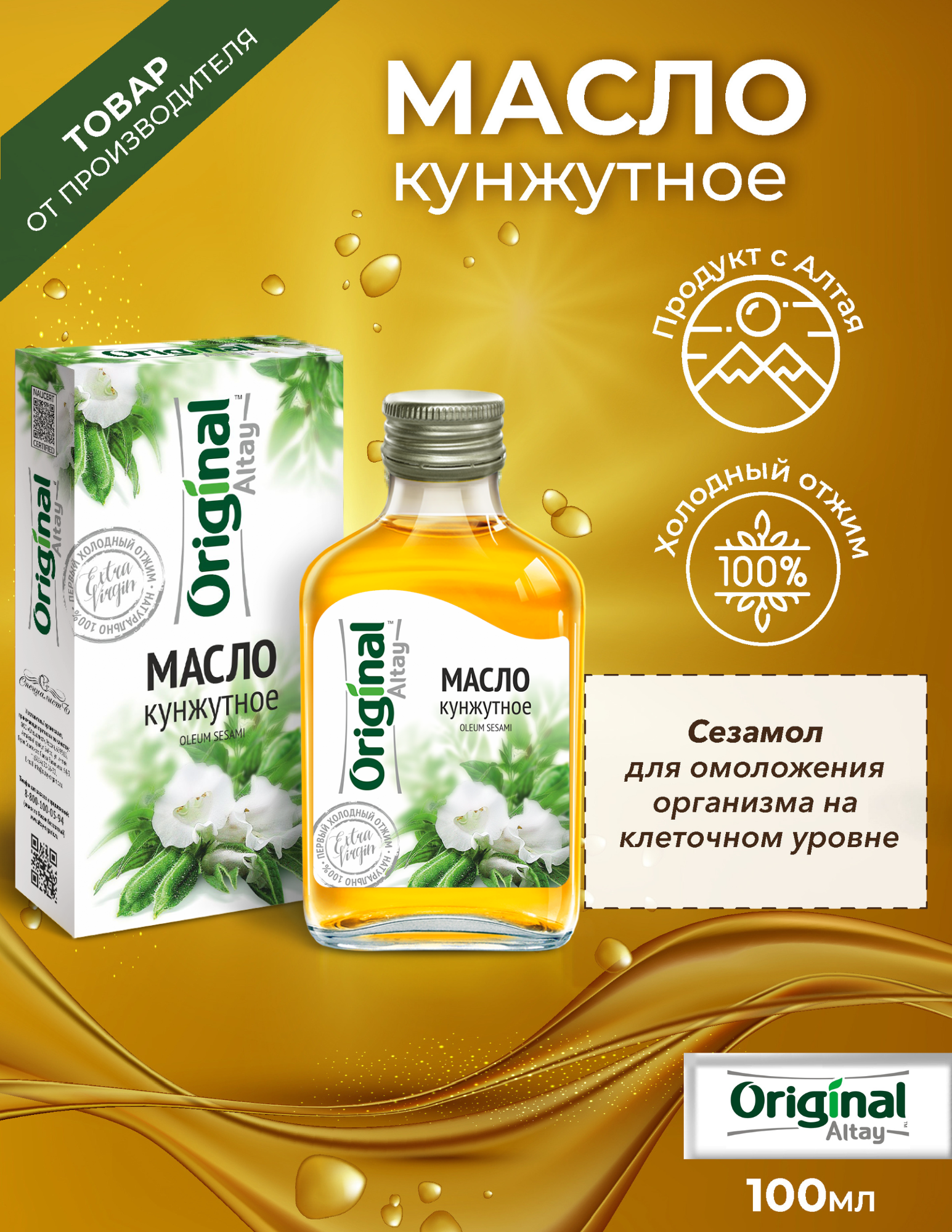 Масло кунжутное 250мл. Алтайское холодного отжима. Altay Organic
