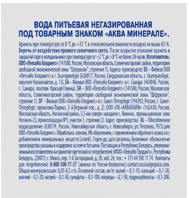 Вода негазированная питьевая AQUA MINERALE 0,5 л, 340038166 621731