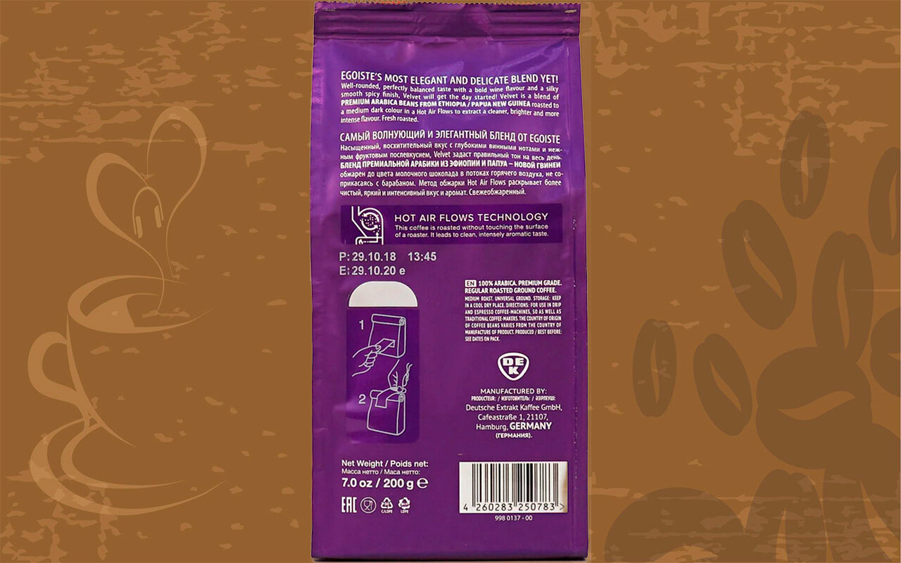 СохранитьКофе молотый Egoiste Velvet Ground Pack, 200 г, вакуумная упаковка интересное: