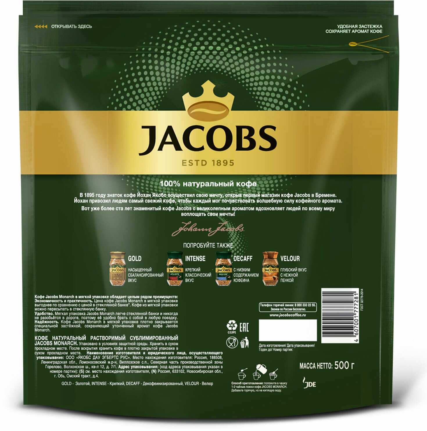 Кофе растворимый Jacobs Monarch, пакет, 500 г