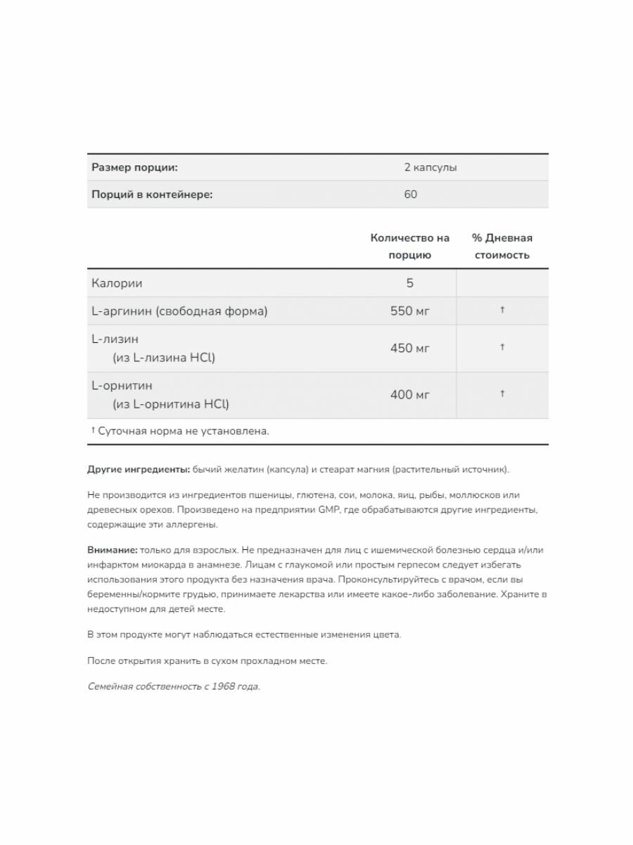 Аминокислоты Комплекс L-Аргинин, L-Орнитин, L-Лизин Amino-Tri Now Foods, 120 капсул