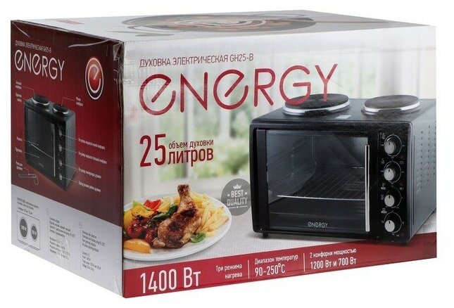 Energy Мини-печь ENERGY GН25-В, 1400 Вт, 25 л, 90-250°C, 2 конфорки, чёрная