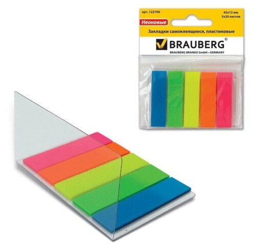 Закладки клейкие BRAUBERG неоновые, пластиковые, 45х12 мм, 5 цветов х 20 листов, на пластиковом основании, 122706