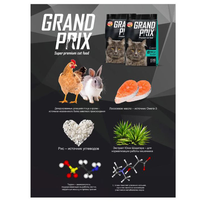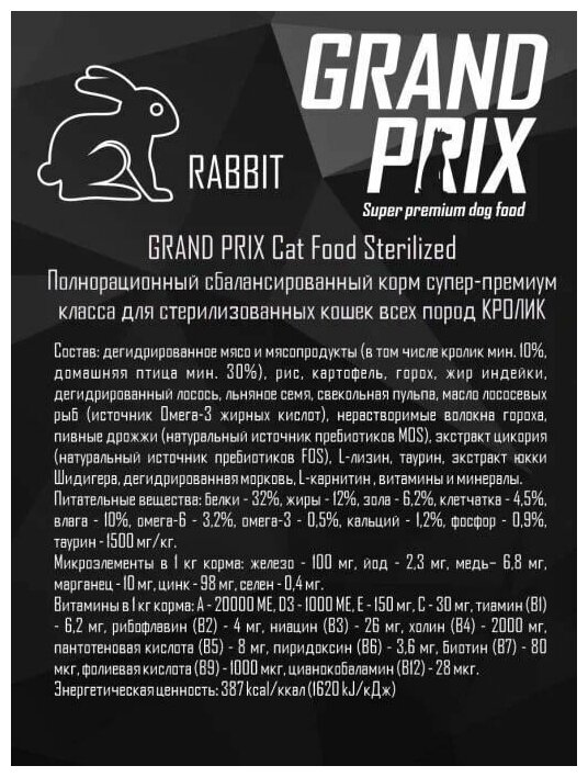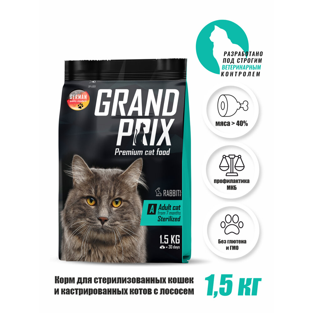 GRAND PRIX ADULT CAT STERILISED для взрослых кастрированных котов и стерилизованных кошек с кроликом (1,5 кг)