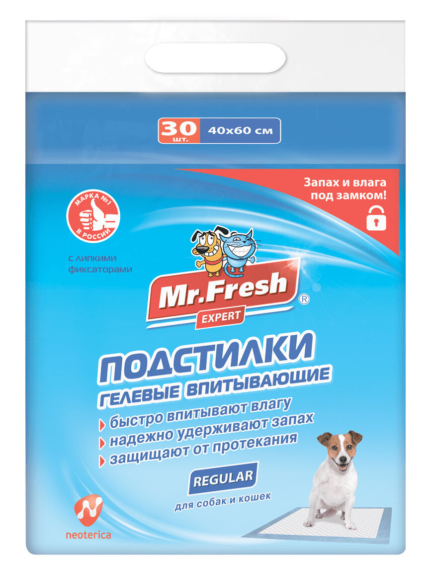 Mr.Fresh Expert Regular Подстилки гелевые впитывающие для собак и кошек, размер 40*60 см, 30 шт