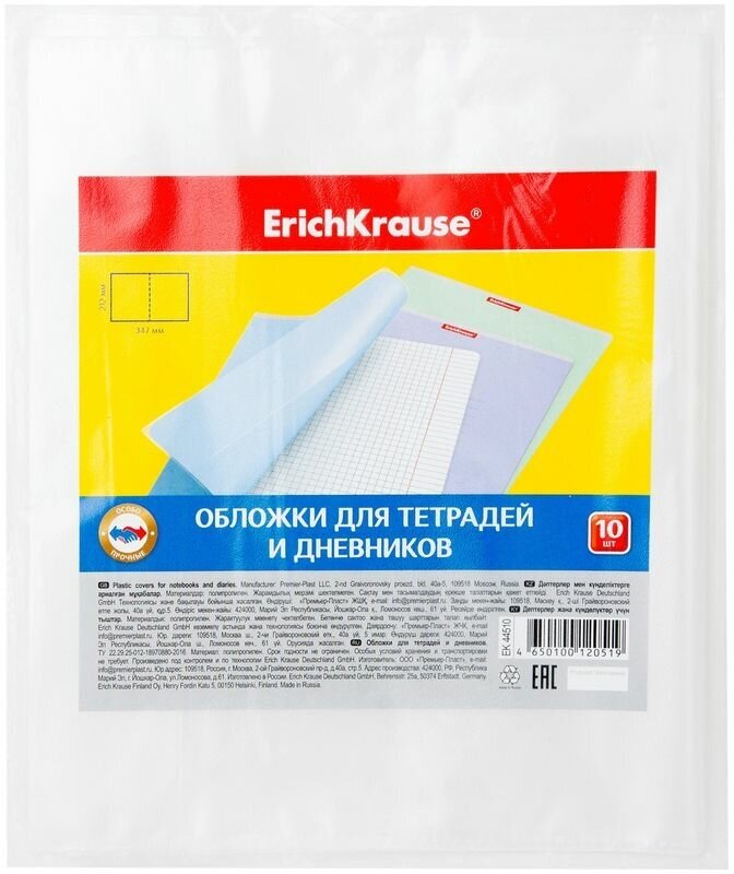Обложки для тетради и дневника Erich Krause 10 шт, прозрачные, 50 мкм, 212х347 мм (44510)