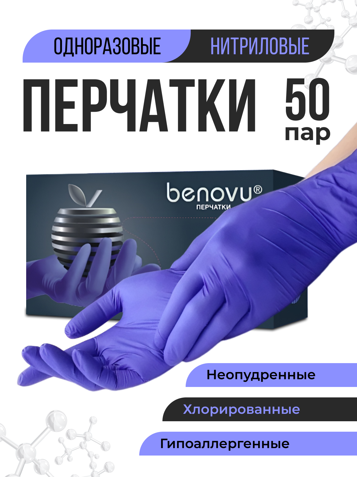 Перчатки нитриловые смотровые Benovy сиренево-голубые (50 пар, M)