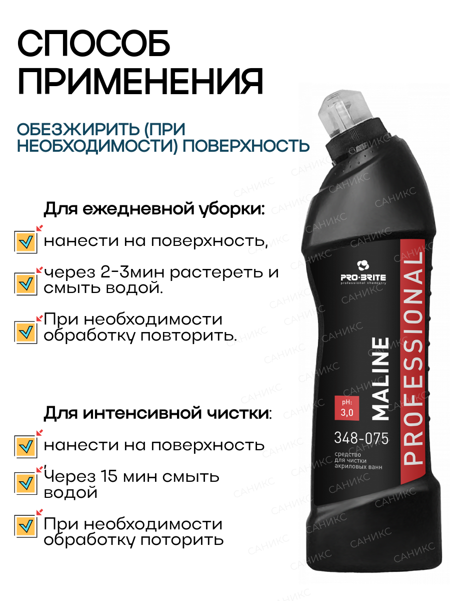 Средство чистящее для акриловых ванн PRO-BRITE MALINE, 500 мл, профессиональное, антиналет
