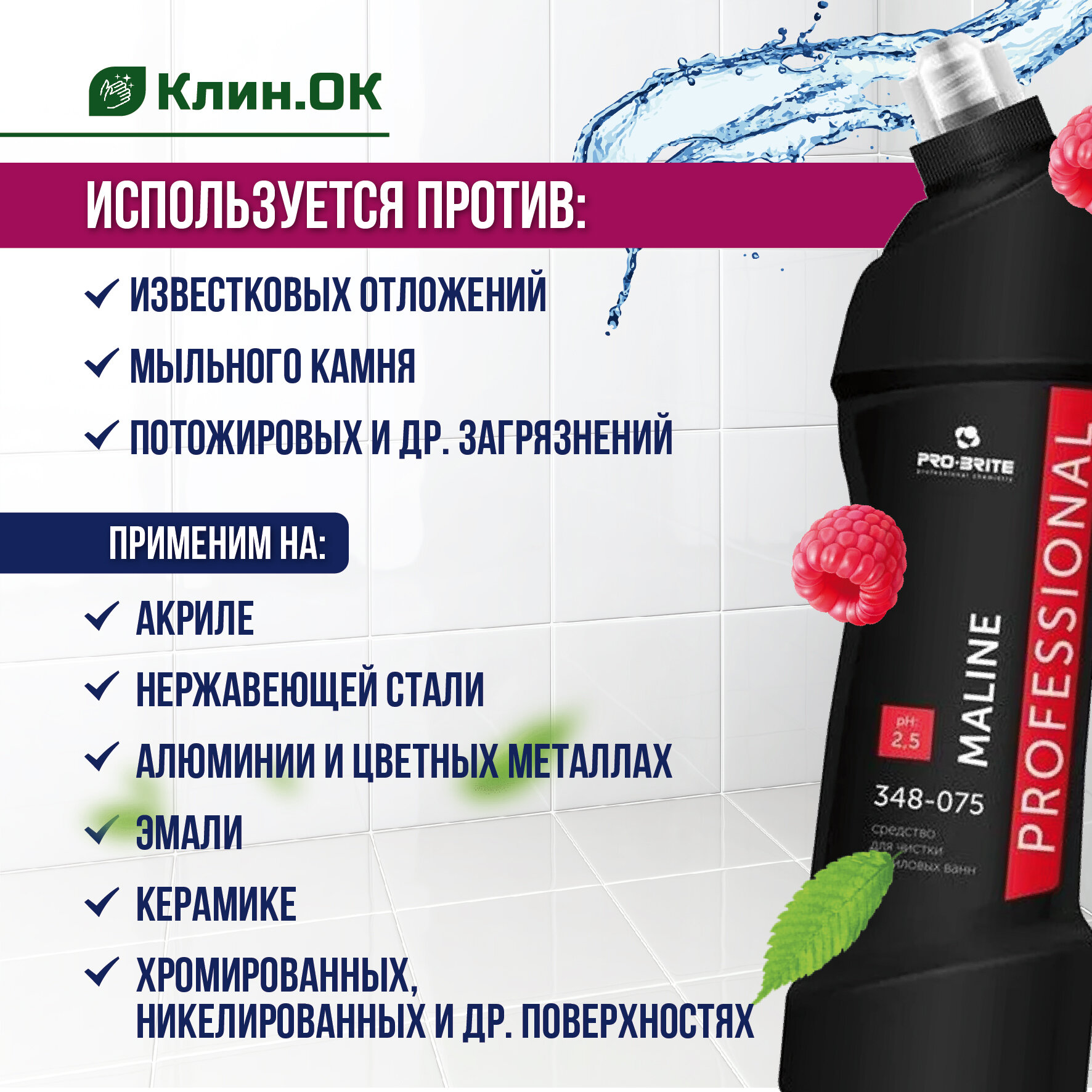 Средство чистящее для акриловых ванн PRO-BRITE MALINE, 500 мл, профессиональное, антиналет