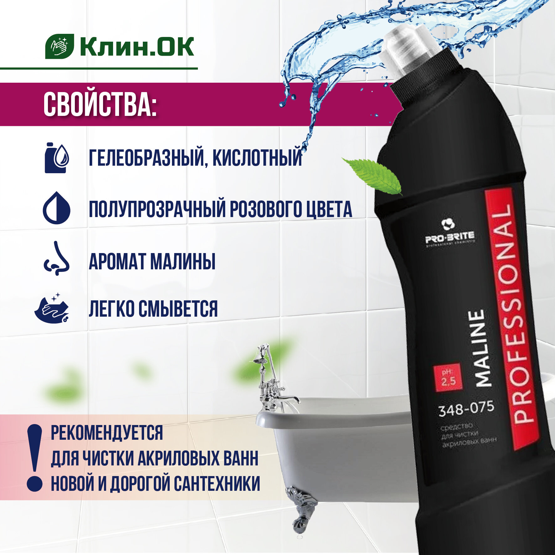 Средство для чистки акриловых ванн и сантехники PRO-BRITE MALINE, 750 мл