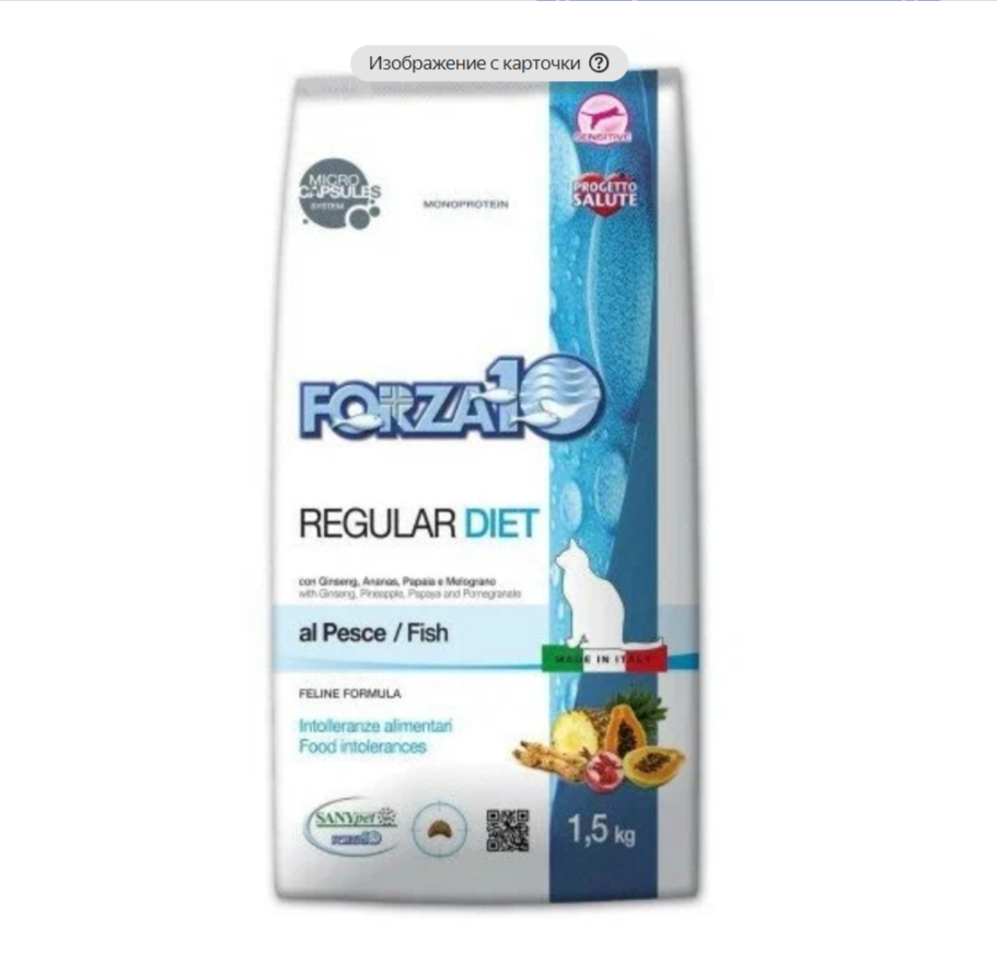 СохранитьКорм сухой Forza10 "Diet" для взрослых кошек, при аллергии и повышенной чувствительности к животным белкам, с океанической рыбой, 1,5 кг интересное: