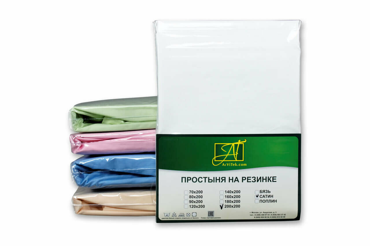 Простынь на резинке AlViTek (АльВиТек) 180х200х25, 2-х спальная, Натяжная, Сатин, 100% хлопок, Цвет белый, AALV-ПР-СО-Р-180-БЕЛ