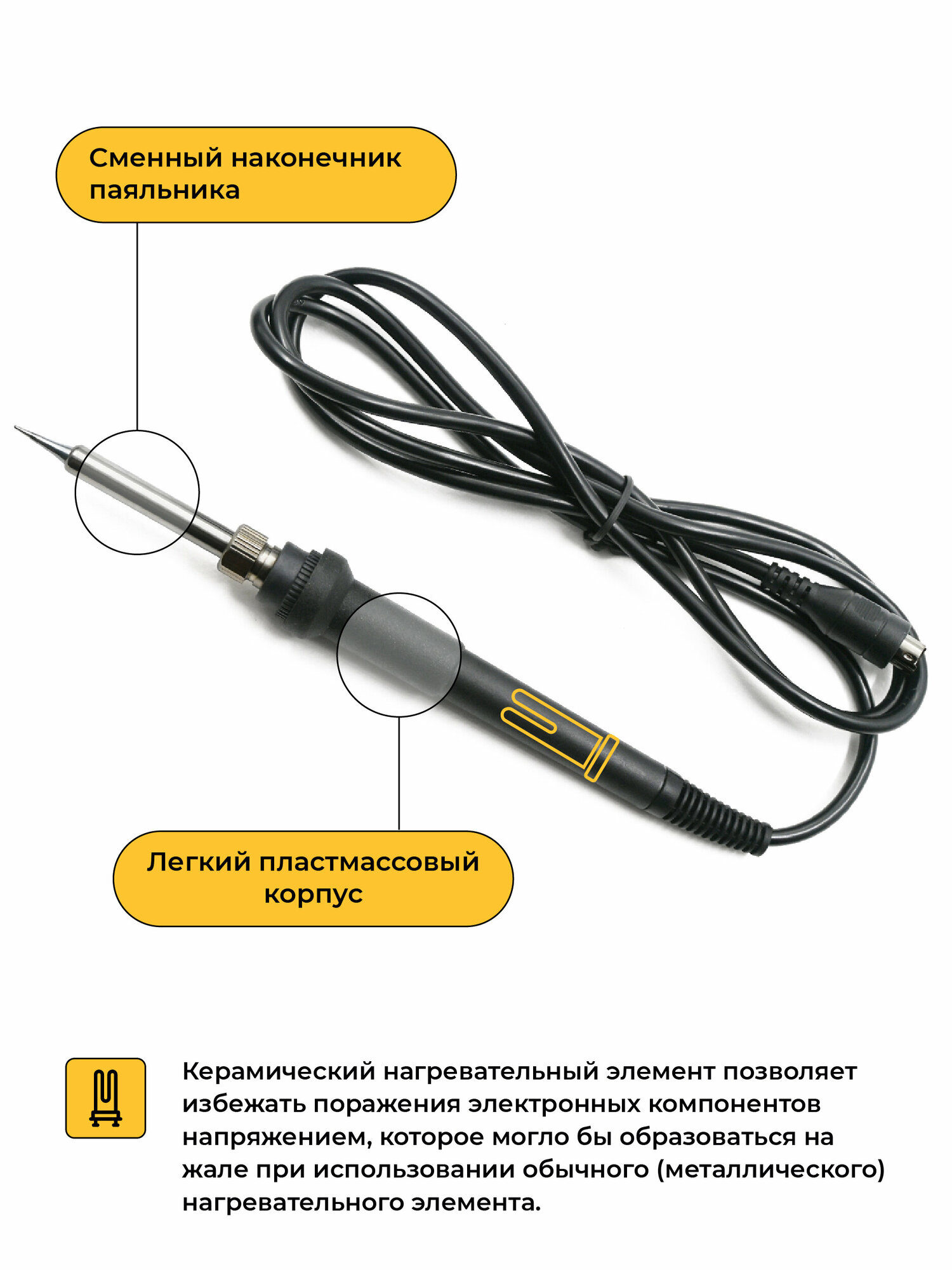 | Плюсы: | Цифровое табло настройки температуры, провода толстые и мягкие, нагрев быстрый. В комплекте были жала, оловоотсос, кусачки |