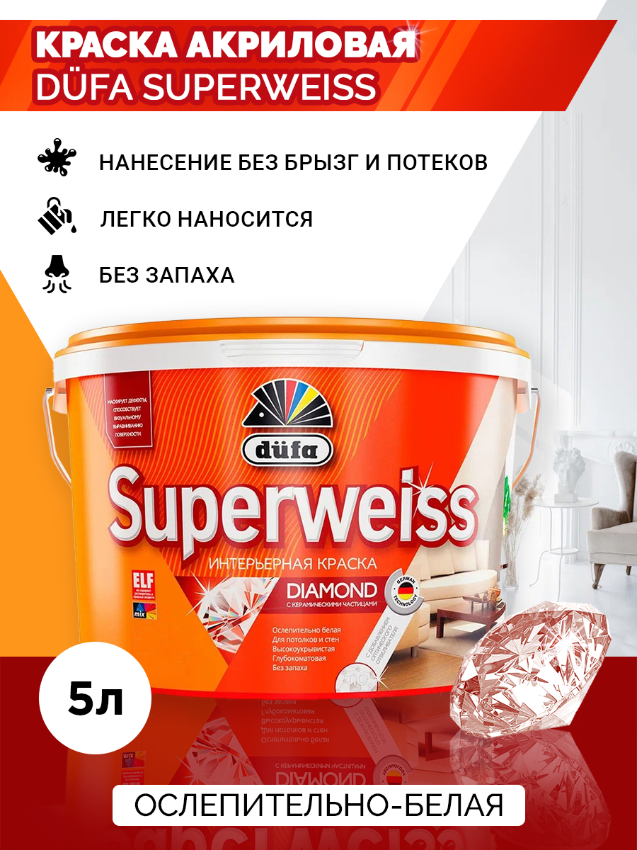 Ниже Вы можете прочитать отзывы на Краска водно-дисперсионная Dufa Superweiss RD4 моющаяся глубокоматовая белый 5 л, ознакомится с подробными характеристиками, посмотреть интересные обзоры и фотографии на Краска водно-дисперсионная Dufa Superweiss RD4 моющаяся глубокоматовая белый 5 л.