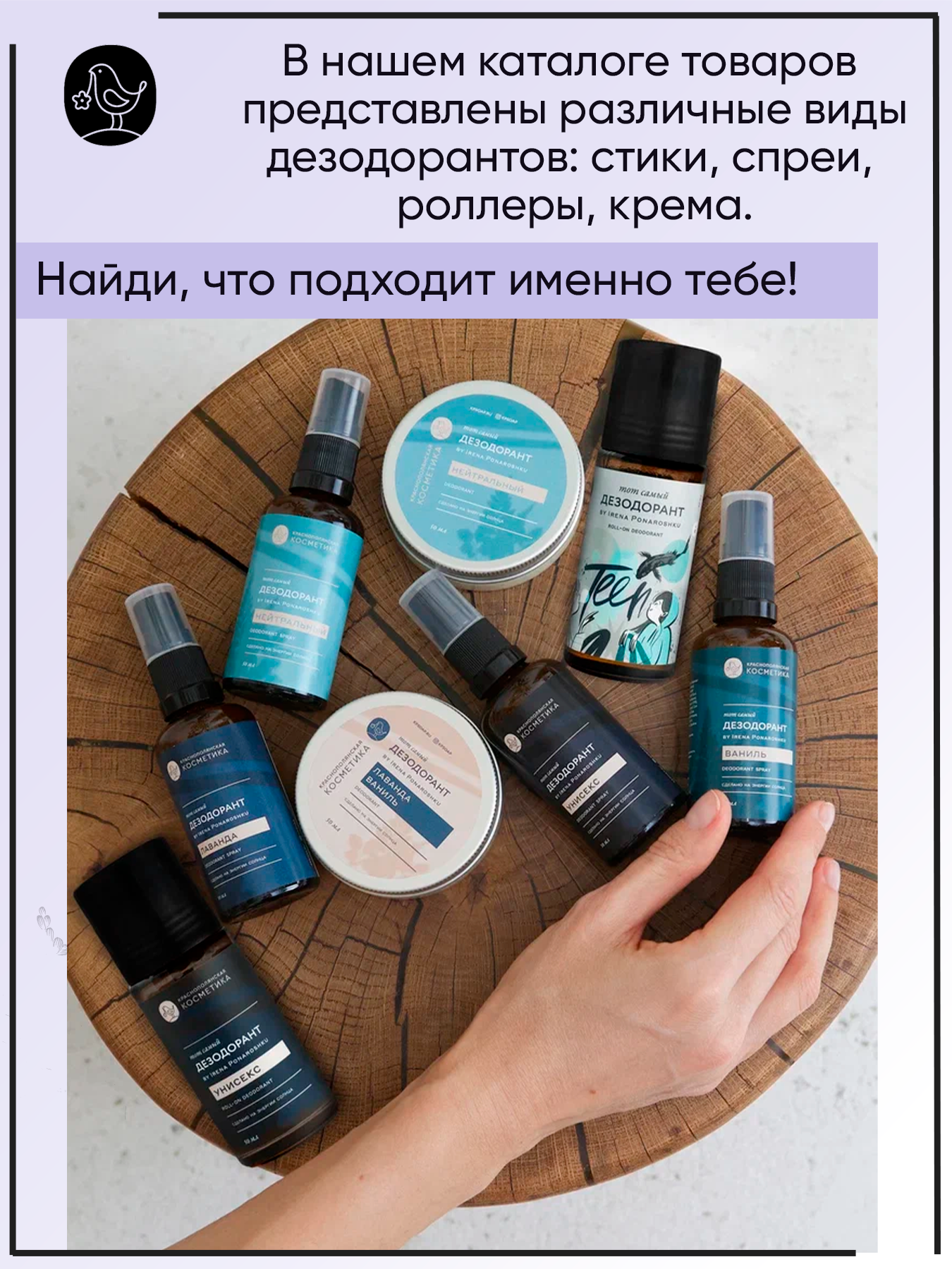 | Минусы: | Продукт, видимо, натуральный, но как пахнет не понравился, отдушек не используется, запах все-таки есть как от "бабушкиного" средства. Сам дезодорант держит "наполовину", для меня лично не подходит, в качестве средства защиты от пота, от запаха пота со своей задачей не справился. |