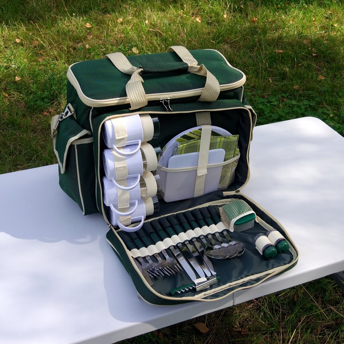 | Комплектация | Количество предметов в сумке на 4 персоны: 34 штуки (ножи, вилки, ложки, тарелки, стаканчики, кружки, салфетки, солонка, перечница, штопор, нож для сыра/масла, разделочная доска, емкость для сыра/масла) |