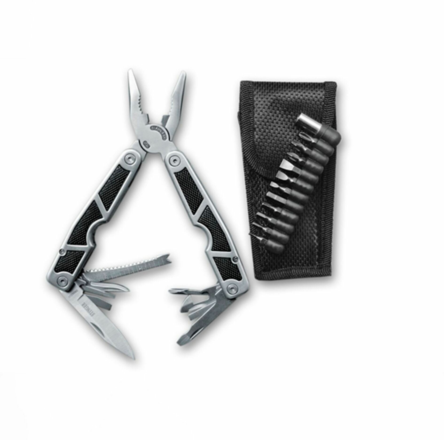 Мультитул Stinger, 10 функций, нержавеющая сталь/алюминий/каучук, серебристо-чёрный, в комплекте 12 насадок и нейлоновый чехол (MT-3011BK)