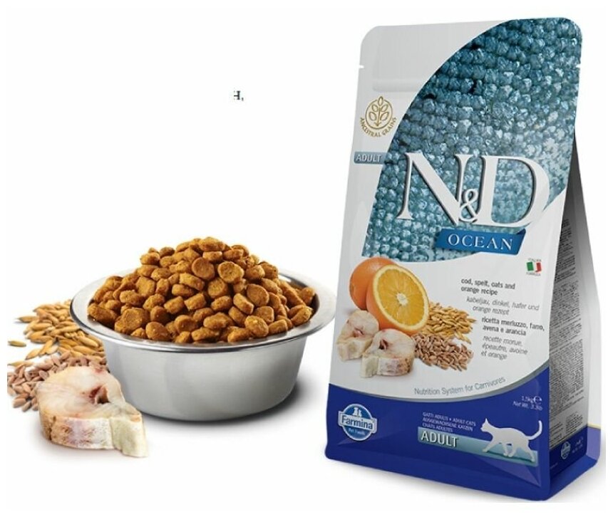 Сухой корм Farmina N&D Ocean Godfish&Orange Adult, для взрослых кошек, низкозерновой, треска, спельта, овес и апельсин, 1,5 кг