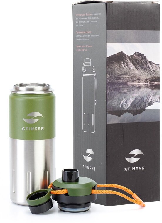 Термобутылка Stinger для горячих и холодных напитков, 0,5 л, сталь/пластик, серебристо-зеленая (HD-500-46MG)