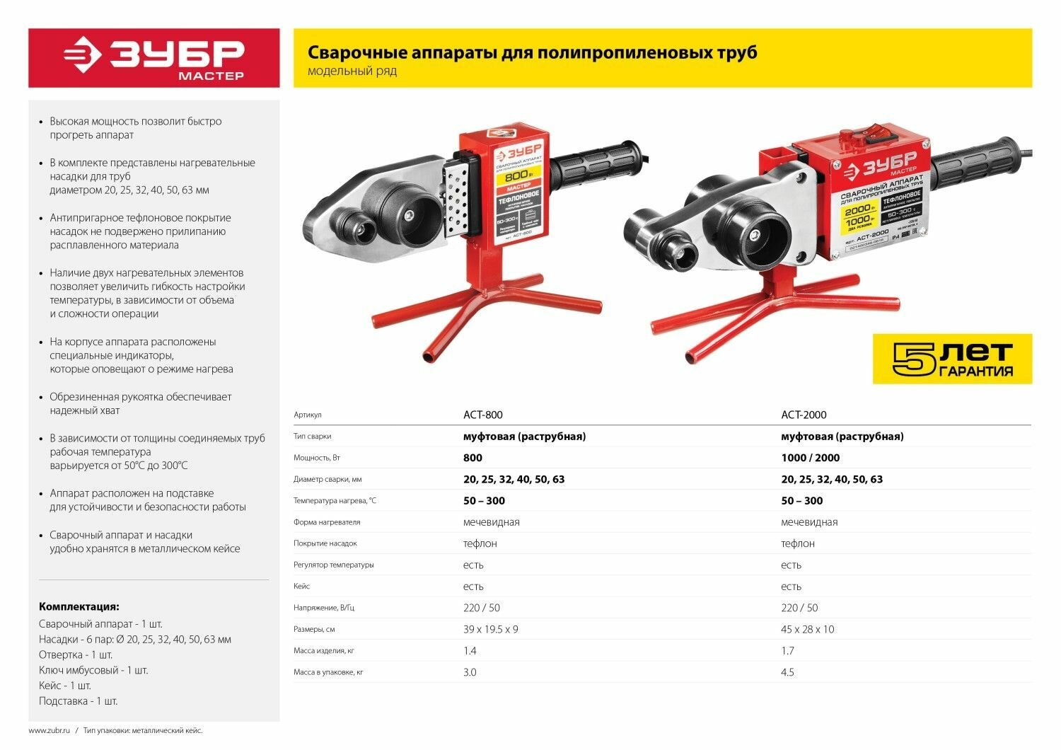 Сварочный аппарат (паяльник) для полипропиленовых труб, ЗУБР Мастер АСТ-800, 800 Вт, 50-300С, насадки 20, 25, 32, 40, 50, 63мм, мет. кейс, 220В