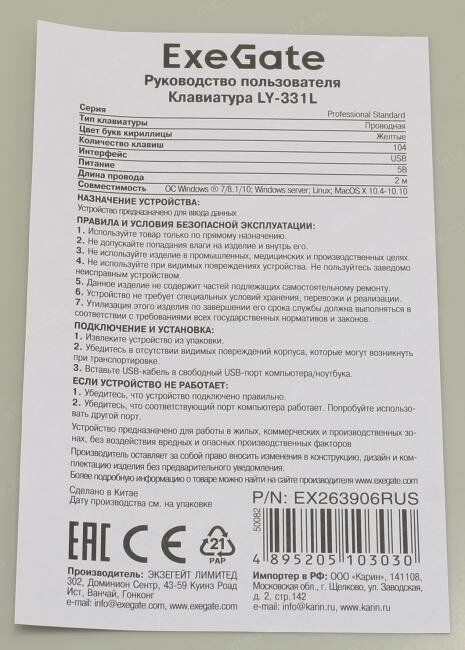 | Комплектация | Клавиатура ExeGate LY-331L черный USB Color box |