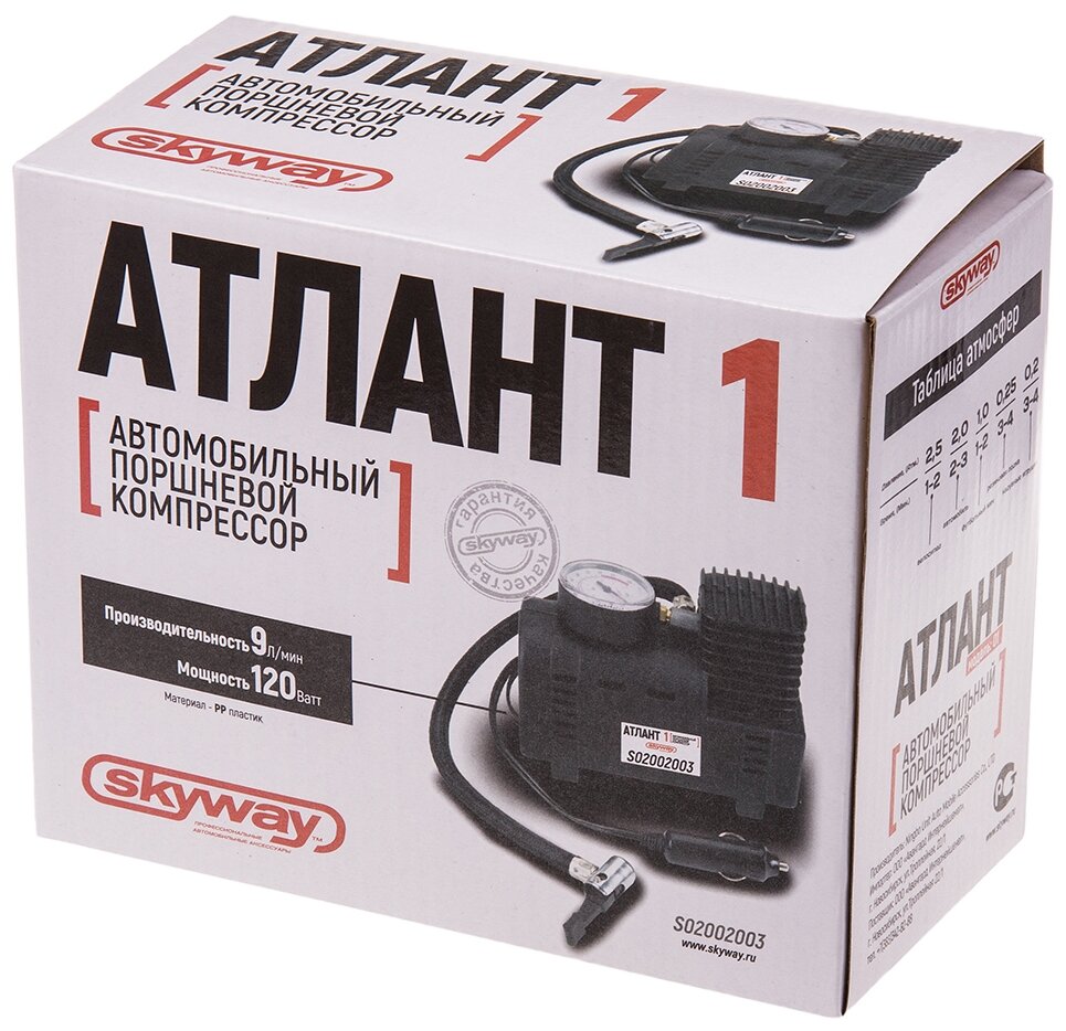SKYWAY Компрессор пластиковый 9л/мин в прикуриватель АТЛАНТ-01 3 вида насадок 20 АТМ S02002003