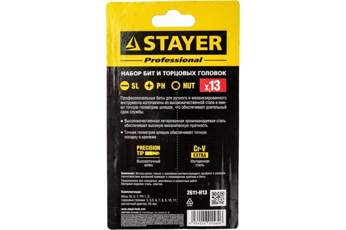 STAYER Набор STAYER "PROFI" Биты с магнитным адаптером и торцевыми головками, 13 предметов, ( 2611-H13 )