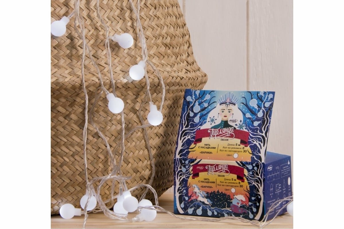 Гирлянда "Нить" 5 м с насадками "Шарики белые", IP20, прозрачная нить, 30 LED, свечение белое, 8 режимов, 220 В