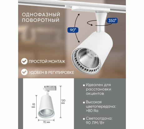 Светильник трековый светодиодный на шинопровод 30W, 2700 Lm, 4000К, 35 градусов, белый, AL100