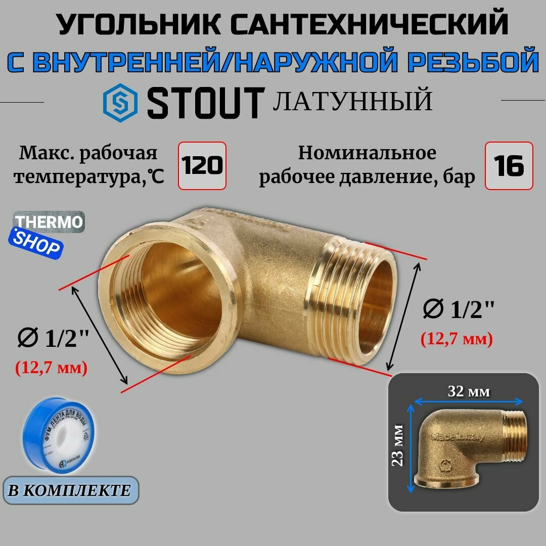 Уголок 1 1/4 НВ 10 шт латунный сантехнический (угол) STOUT ФУМ лента 10 м