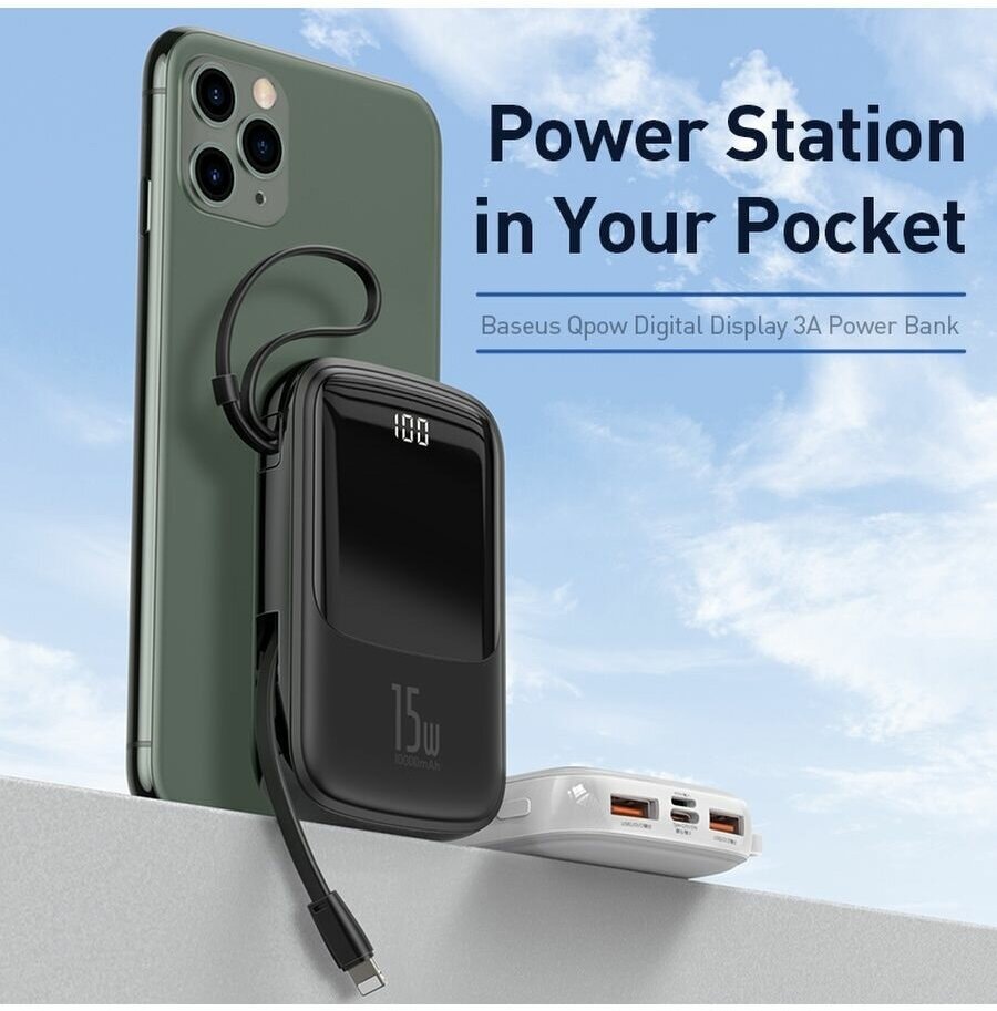 Портативный аккумулятор BASEUS Qpow, 3A, 10000 мА ч, белый, с кабелем Lightning