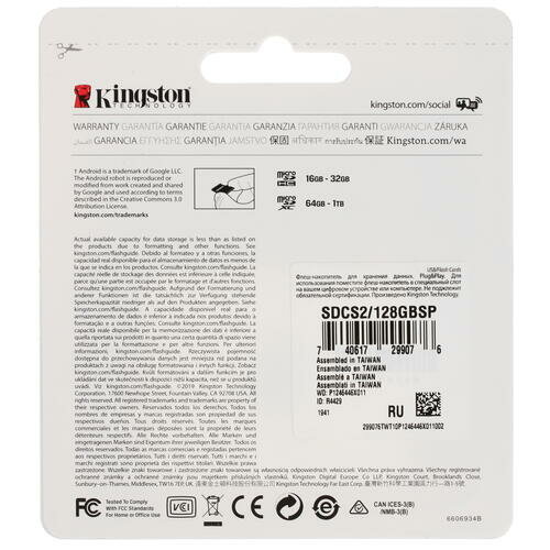 Карта памяти MicroSD Kingston SDCS2/128GB с адаптером