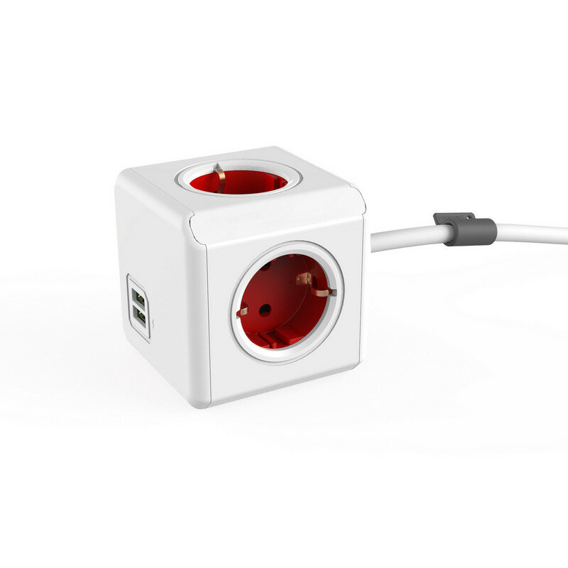 Сетевой удлинитель (фильтр) Allocacoc/DesignNest PowerCube Extended USB 1402RD/DEEUPC, 4 розетки, 2 USB, провод 1,5 метра, крепление в комплекте, красный