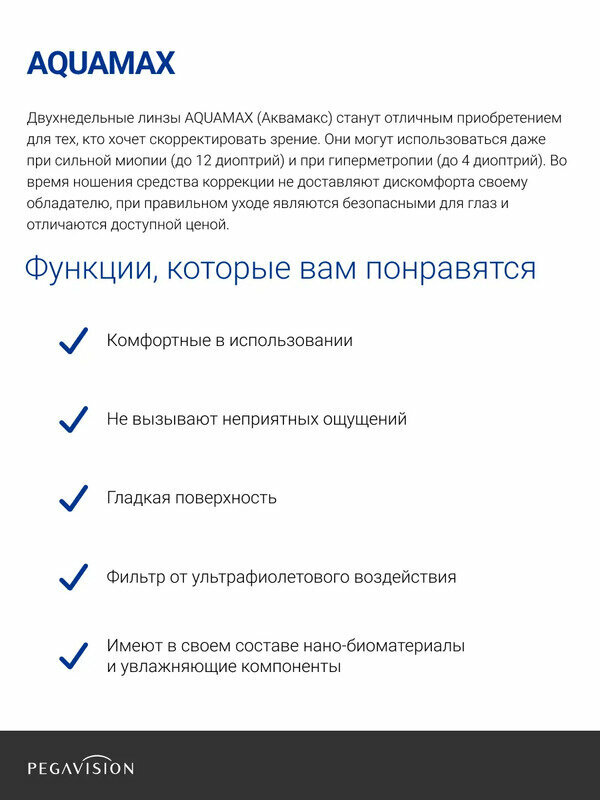 Квартальные контактные линзы Aquamax 38 Pegavision 4 pk (BC 8.6; D -6.00)