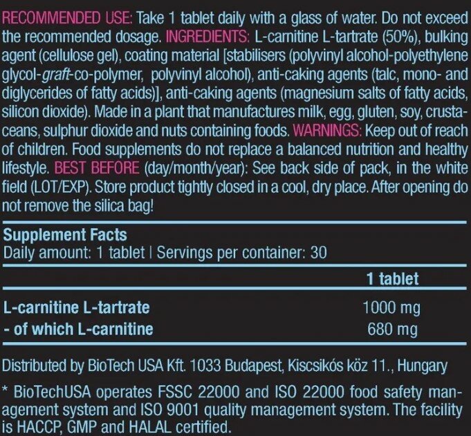 BioTechUSA L-Carnitine 1000 мг 30 табл (BioTechUSA)