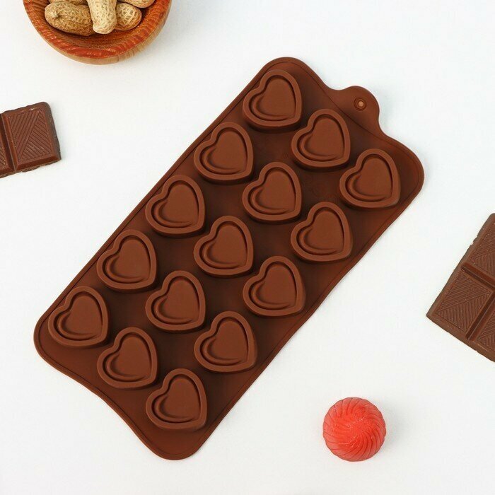 Форма для шоколада Доляна «Сладкое сердце», силикон, 21×10×1,5 см, 15 ячеек (2,9×2,7 см), цвет коричневый (арт. 2854843)
