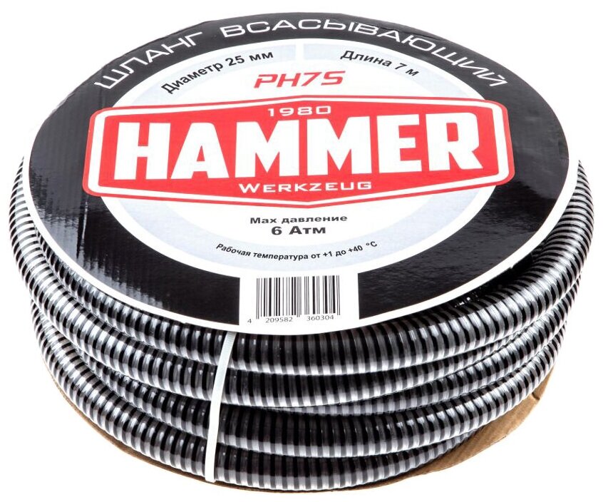 Шланг всасывающий Hammer PH7S длина 7м, диаметр 25мм, 1", обратный клапан с фильтрующей сеткой