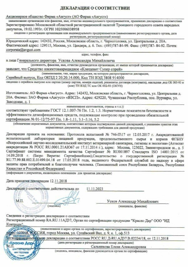 | Плюсы: | Качественный спрей,при походах в лес клещей не обнаружено, разумная цена |