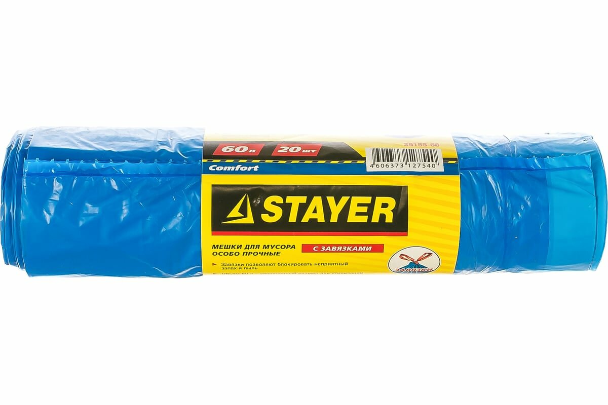 Купить Мусорные мешки Stayer 60л, 20шт, особопрочные с завязками, синие, COMFORT, (39155-60)