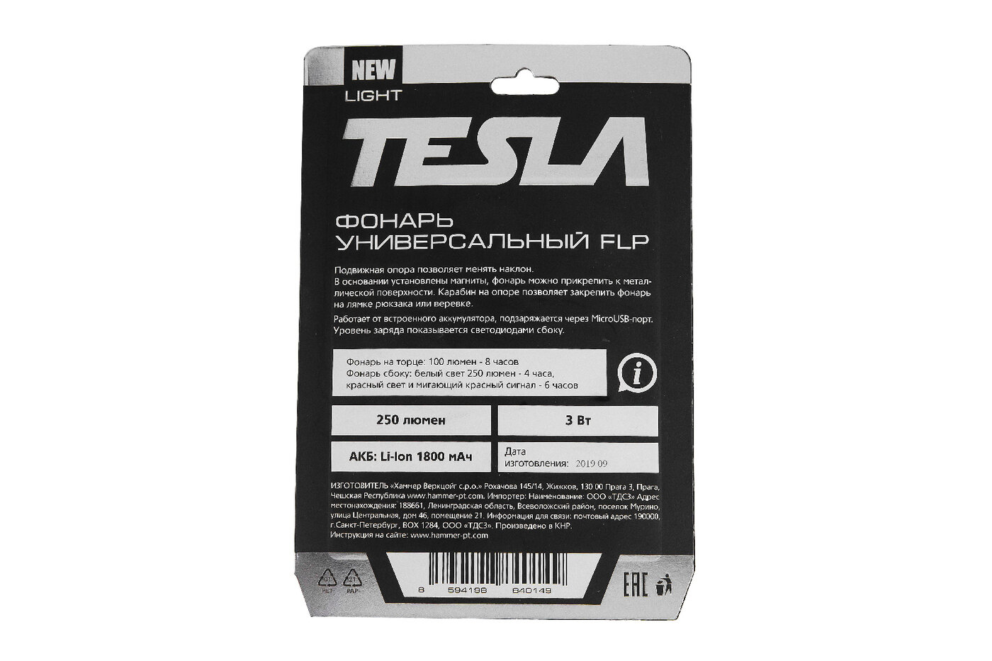TESLA Фонарь универсальный FLP Li-ion, 3Вт, 250люмен 628657