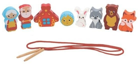 Шнуровка деревянная на шнурке Теремок + Колобок 10 деталей 3-6 см, развитие мелкой моторики Mapacha